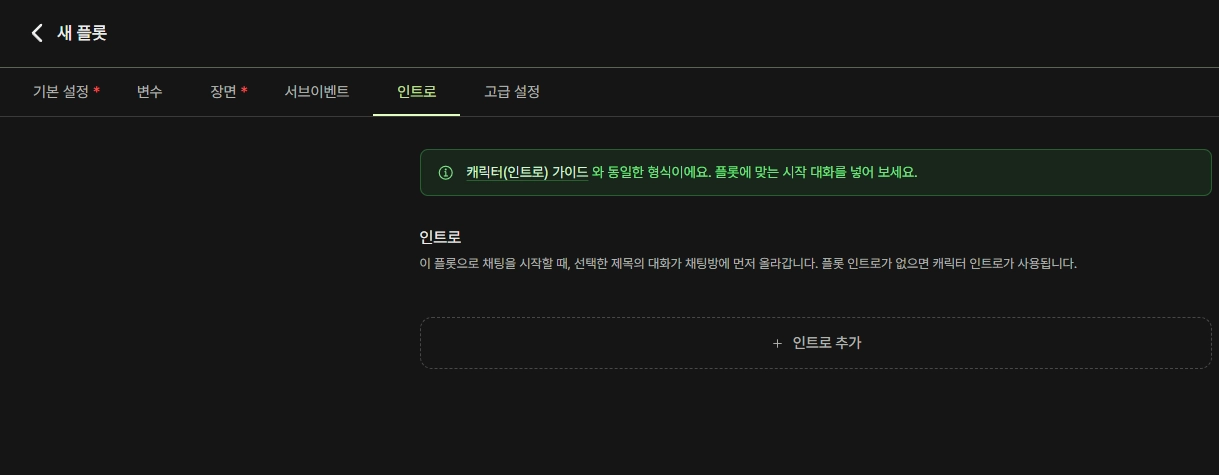 캐릭터 기본 플롯으로 시작하시면 맨 앞에 캐릭터 인트로 대화가 선택되고, 다른 플롯을 고르시면 해당 플롯에 적어 두신 플롯 인트로 대화가 가장 먼저 선택됩니다. 플롯으로 분위기와 전개를 바꾸실 때도 첫 장면과 대화가 한결 매끄럽게 맞물리길 바랍니다.